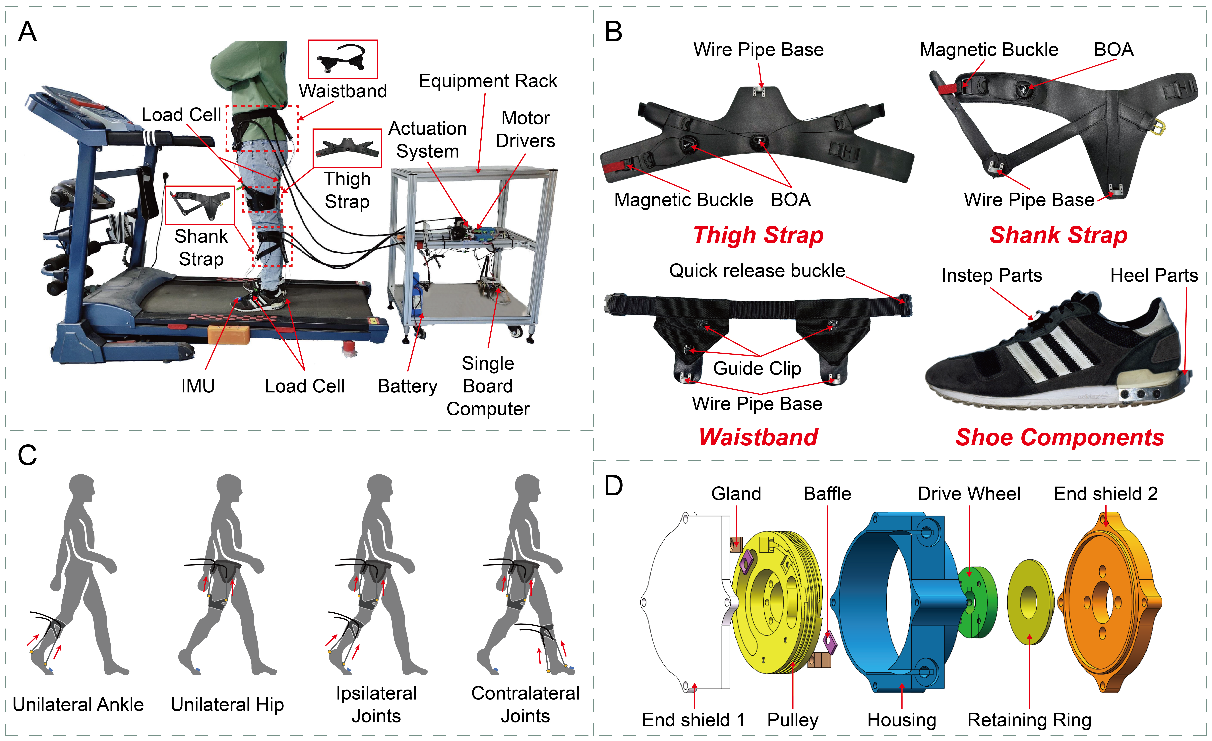 柔性外骨骼机器人系统:(A)系统构型与关键部件(B)柔性穿戴本体(C)模块化辅助配置(D)双向线轮执行器 |