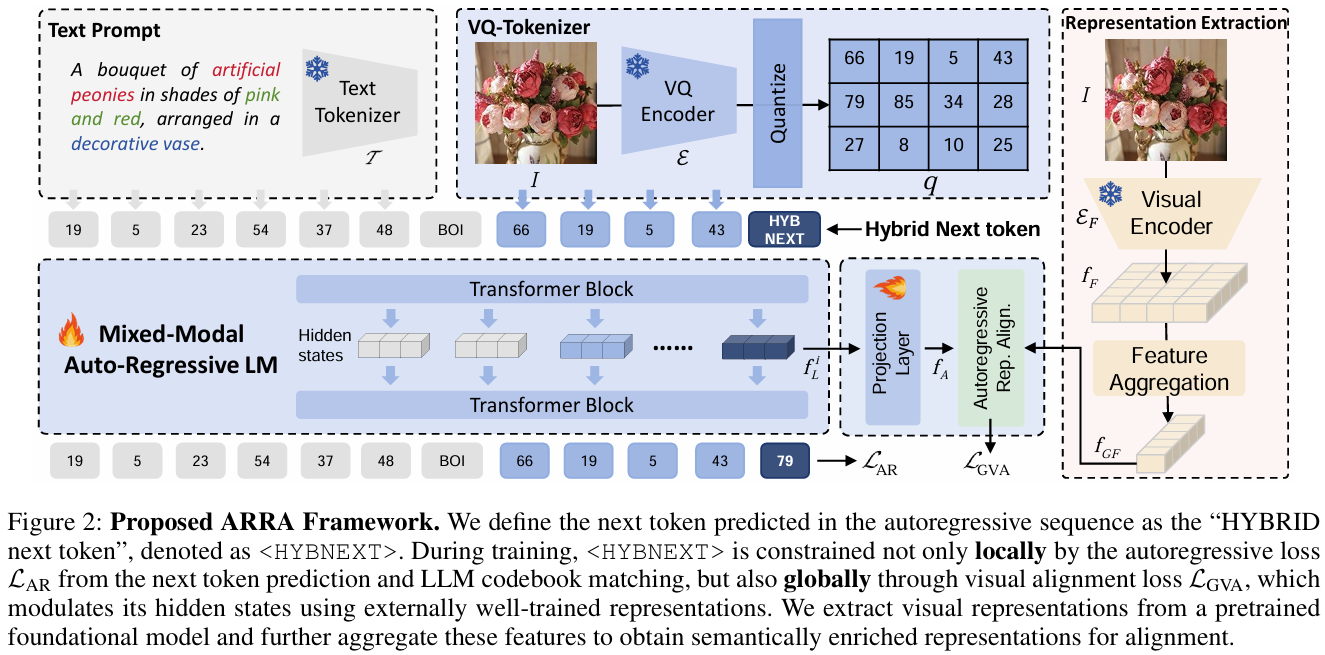 在多模态大模型视觉生成方面,研究团队提出了一种专家表征对齐的多模态大模型训练框架ARRA,可有效促进大模型学习跨模态表征,实现多任务通用多模态生成。相关研究成果Unleashing the Potential of Large Language Models for Text-to-Image Generation through Autoregressive Representation Alignment被大会选为口头汇报(Oral)论文,论文第一作者为博士生谢兴,通讯作者为范慧杰研究员与屈靓琼助理教授。