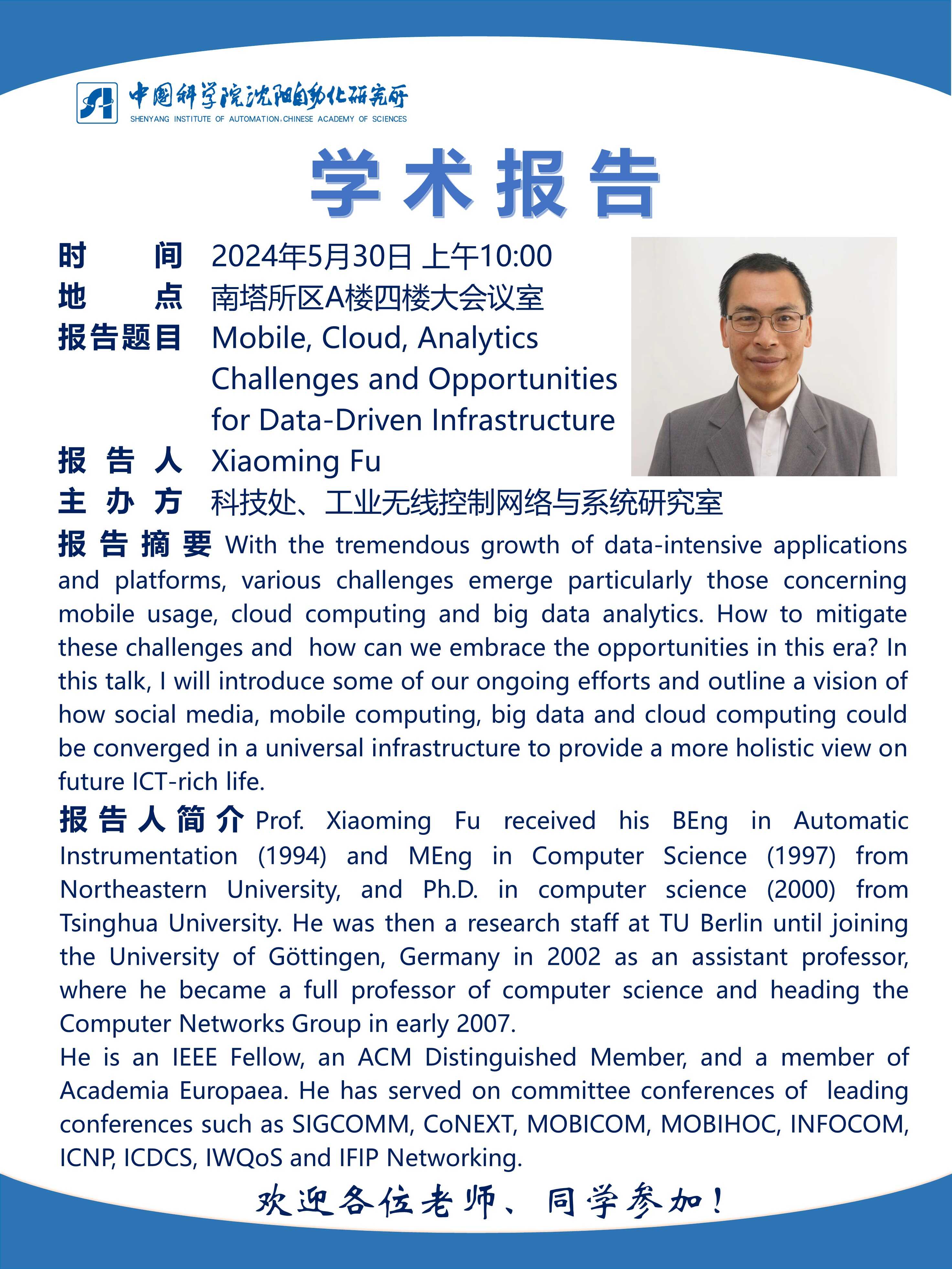 关于举办“Mobile, Cloud, Analytics Challenges and Opportunities for Data-Driven Infrastructure”学术报告的通知
