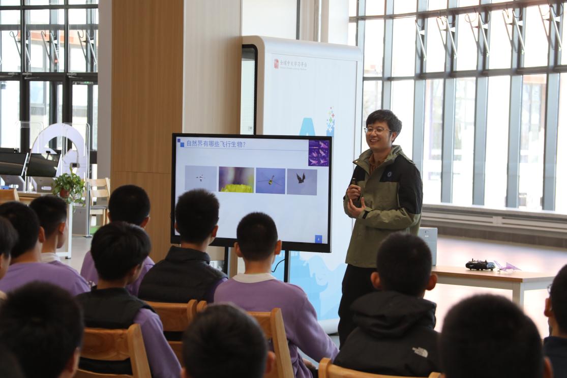 王宏伟通过图片、视频、动画以及实物展示,详细介绍了仿生扑翼机器人的工作原理,以及科研人员如何从自然中汲取灵感开展科学研究的过程。他表示,希望同学们时刻保持好奇心,善于运用科学思维去理解和观察世界。科普报告后,同学们还近距离观了解了扑翼机器人的构成和飞行过程。